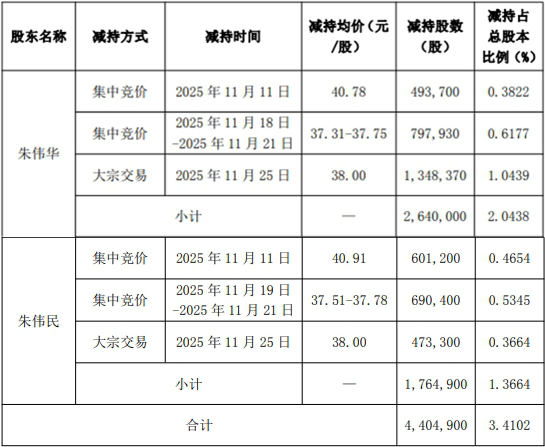 Core Viewpoint - Jiajun Technology (301117.SZ) experienced significant stock price fluctuations, with a cumulative increase of 31.11% over three consecutive trading days, triggering abnormal trading conditions as per Shenzhen Stock Exchange regulations [1] Shareholder Actions - Vice Chairman and General Manager Zhu Weimin and Deputy General Manager Zhu Weihua sold shares during the period of abnormal trading [1] - Zhu Weihua reduced his holdings from 10,066,640 shares to 7,920,340 shares, a decrease from 7.7934% to 6.1318% of total shares [1] - Zhu Weimin's holdings decreased from 6,458,405 shares to 5,294,705 shares, reducing his stake from 5.0000% to 4.0991% [1] Share Reduction Details - Zhu Weihua's share reductions included: - 493,700 shares at an average price of 40.78 CNY/share on November 11, 2025 [2] - 797,930 shares at an average price between 37.31 CNY/share and 37.75 CNY/share from November 18 to November 21, 2025 [2] - 1,348,370 shares at an average price of 38.00 CNY/share on November 25, 2025 [2] - Total reduction amounted to approximately 1 billion CNY [2] - Zhu Weimin's share reductions included: - 601,200 shares at an average price of 40.91 CNY/share on November 11, 2025 [2] - 690,400 shares at an average price between 37.51 CNY/share and 37.78 CNY/share from November 19 to November 21, 2025 [2] - 473,300 shares at an average price of 38.00 CNY/share on November 25, 2025 [2] - Total reduction amounted to approximately 0.7 billion CNY [2] Total Share Reduction - The combined total of shares reduced by Zhu Weihua and Zhu Weimin from November 11 to November 25, 2025, was 4,404,900 shares, with a total monetary value of approximately 1.7 billion CNY [3]