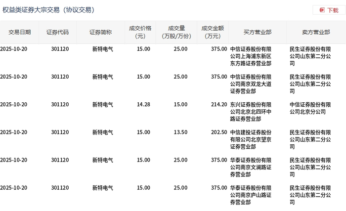 | 交易日期 | 证券代码 | 证券简称 | 成交价格 | 成交量 | 成交金额 买方营业部 | 卖方营业部 | | --- | --- | --- | --- | --- | --- | --- | | | | | (元) | (万股/万份) | (万元) | | | 2025-10-20 | 301120 | 新特电气 | 15.00 | 25.00 | 375.00 中信证券股份有限 | 民生证券股份有限 | | | | | | | 公司上海浦东新区 | 公司山东第二分公 | | | | | | | 东方路证券营业部 | Ta | | 2025-10-20 | 301120 | 新特电气 | 15.00 | 25.00 | 375.00 中信证券股份有限 | 民生证券股份有限 | | | | | | | 公司南京双龙大道 | 公司山东第二分公 | | | | | | | 证券营业部 | n | | 2025-10-20 | 301120 | 新特电气 | 14.28 | 15.00 | 214.20 东兴证券股份有限 | 中信证券股份有限 | | | | | | | 公司北京北四环中 | 公司北京分公司 ...