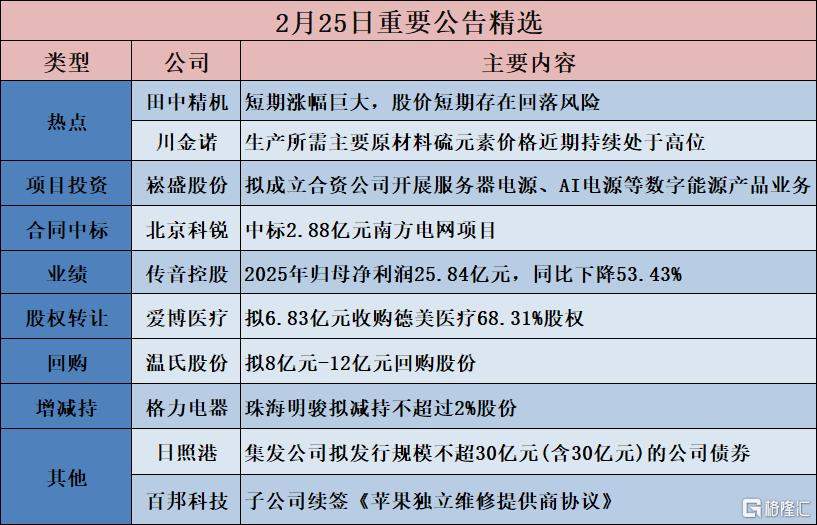 | | | 2月25日重要公告精选 | | --- | --- | --- | | 类型 | 公司 | 主要内容 | | 热点 | 田中精机 | 短期涨幅巨大,股价短期存在回落风险 | | | 川金诺 | 生产所需主要原材料硫元素价格近期持续处于高位 | | 项目投资 | 松盛股份 | 拟成立合资公司开展服务器电源、AI电源等数字能源产品业务 | | 合同中标 | 北京科锐 | 中标2.88亿元南方电网项目 | | 业绩 | 传音控股 | 2025年归母净利润25.84亿元,同比下降53.43% | | 股权转让 | 爱博医疗 | 拟6.83亿元收购德美医疗68.31%股权 | | 回购 | 温氏股份 | 拟8亿元-12亿元回购股份 | | 增减持 | 格力电器 | 珠海明骏拟减持不超过2%股份 | | 其他 | 日照港 | 集发公司拟发行规模不超30亿元(含30亿元)的公司债券 | | | 百邦科技 | 子公司续签《苹果独立维修提供商协议》 昼間隆に | 【热点】 田中精机(300461.SZ):短期涨幅巨大,股价短期存在回落风险 川金诺(300505.SZ):生产所需主要原材料硫元素价格近期持续处于高位, ...