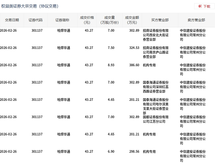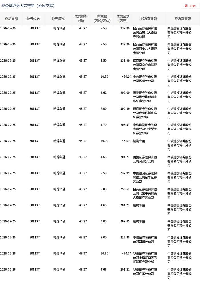 | 交易日期 | 证券代码 | 证券简称 | 成交价格 | 成交量 | 成交金额 买方营业部 | 卖方营业部 | | --- | --- | --- | --- | --- | --- | --- | | | | | (元) | (万股/万份) | (万元) | | | 2026-02-25 | 301137 | 哈炜花漫 | 43.27 | 5.50 | 237.99 招商证券股份有限 | 中信建投证券股份 | | | | | | | 公司西安北大街证 | 有限公司常州分公 | | | | | | | 券营业部 | ם | | 2026-02-25 | 301137 | 哈焊华通 | 43.27 | 5.50 | 237.99 招商证券股份有限 | 中信建投证券股份 | | | | | | | 公司西安北大街证 | 有限公司常州分公 | | | | | | | 券营业部 | n | | 2026-02-25 | 301137 | 哈焊华通 | 43.27 | 5.50 | 237.99 招商证券股份有限 | 中信建投证券股份 | | | | | | | 公司南京庐山路证 | 有限公司常州分公 | | | | ...