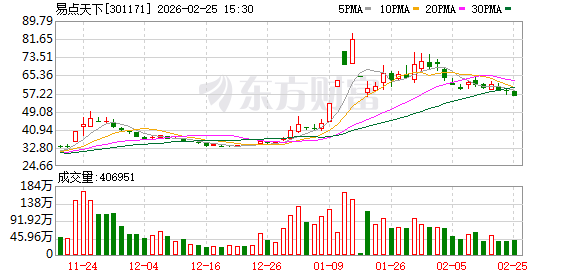 来自陕西西安高新区的A股上市公司易点天下(301171.SZ)发布公告,于2026年2月25日召开第五届董事 会第八次会议,审议通过了《关于聘请 H 股发行并上市审计机构的议案》,同意聘请毕马威为公司发 行境外上市外资股(H 股)股票并申请在香港联合交易所有限公司主板挂牌上市的审计机构。 易点天下,作为一家率先在出海营销领域布局AIGC战略的营销科技公司,秉持"科技使世界变得更 平"的使命,致力于 以"出海服务"为核心,为企业提供出海整合营销、数字营销、广告变现在内的营销 服务,以及AI数字创意、BI决策、 CI 智能化多云管理等出海数字化服务。 易点天下(301171.SZ)于2022年8月19日在深交所上市,截至2026年2月26日发稿时间,其总市值约266.29 亿元人民币。 | 最高:56.68 | 今开:56.31 | 涨停: 67.28 | 成交量 | | --- | --- | --- | --- | | 最低:55.31 | 昨收:56.07 | 跌停: 44.86 | 成交额 | | 换手:4.83% | 盘后量: -- | 量比:0.76 | 总市值 | | 振幅:2.44% | 盘后额: ...
