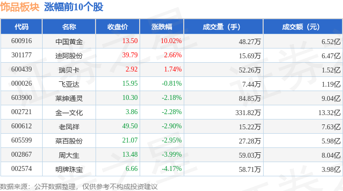 从资金流向上来看,当日饰品板块主力资金净流入7.44亿元,游资资金净流出1.48亿元,散户资金净流出 5.96亿元。饰品板块个股资金流向见下表: | 代码 | 名称 | 收盘价 | 涨跌幅 | 成交量(手) | 成交额(元) | | | --- | --- | --- | --- | --- | --- | --- | | 301177 | 迪阿股份 | 38.76 | 20.00% | 11.75万 | | 4.24亿 | | 300945 | 曼卡龙 | 24.70 | 19.96% | 68.98万 | | 15.78亿 | | 600916 | 中国黄金 | 12.27 | 10.04% | 30.45万 | | 3.74亿 | | 603900 | 苹细通灵 | 10.53 | 10.03% | 41.67万 | | 4.32亿 | | 002721 | 金一文化 | 3.95 | 10.03% | 174.93万 | | 6.66亿 | | 605599 | 菜自股份 | 21.71 | 9.98% | 14.15万 | | 2.98亿 | | 600612 | 老凤祥 | 50.98 | 9.0 ...