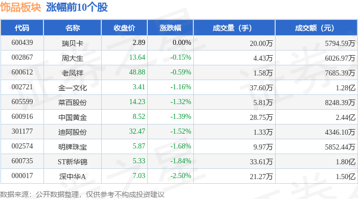 饰品板块10月15日涨0.85%,ST新华锦领涨,主力资金净流入298.29万元