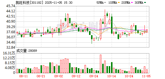 分红方面,凯旺科技A股上市后累计派现3832.87万元。近三年,累计派现958.22万元。 11月11日,凯旺科技跌1.89%,成交额6172.17万元。两融数据显示,当日凯旺科技获融资买入额743.99 万元,融资偿还651.21万元,融资净买入92.78万元。截至11月11日,凯旺科技融资融券余额合计1.20亿 元。 责任编辑:小浪快报 融资方面,凯旺科技当日融资买入743.99万元。当前融资余额1.20亿元,占流通市值的3.45%,融资余 额超过近一年90%分位水平,处于高位。 资料显示,河南凯旺电子科技股份有限公司位于河南省周口市沈丘县沙南产业集聚区,成立日期2009年 11月4日,上市日期2021年12月23日,公司主营业务涉及电子精密线缆连接组件的研发、生产和销售。 主营业务收入构成为:安防类56.70%,消费类及其他35.32%,组装加工业务6.00%,通讯类1.99%。 截至10月31日,凯旺科技股东户数1.13万,较上期减少2.42%;人均流通股8502股,较上期增加2.48%。 2025年1月-9月,凯旺科技实现营业收入5.15亿元,同比增长17.55%;归母净利润-5071.56万元,同 ...