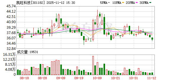 资料显示,河南凯旺电子科技股份有限公司位于河南省周口市沈丘县沙南产业集聚区,成立日期2009年 11月4日,上市日期2021年12月23日,公司主营业务涉及电子精密线缆连接组件的研发、生产和销售。 主营业务收入构成为:安防类56.70%,消费类及其他35.32%,组装加工业务6.00%,通讯类1.99%。 截至11月10日,凯旺科技股东户数1.14万,较上期增加1.08%;人均流通股8411股,较上期减少1.07%。 2025年1月-9月,凯旺科技实现营业收入5.15亿元,同比增长17.55%;归母净利润-5071.56万元,同比减 少31.87%。 11月12日,凯旺科技跌1.96%,成交额6933.75万元。两融数据显示,当日凯旺科技获融资买入额403.62 万元,融资偿还1033.43万元,融资净买入-629.81万元。截至11月12日,凯旺科技融资融券余额合计 1.14亿元。 融资方面,凯旺科技当日融资买入403.62万元。当前融资余额1.14亿元,占流通市值的3.34%,融资余 额超过近一年80%分位水平,处于高位。 融券方面,凯旺科技11月12日融券偿还0.00股,融券卖出0.00股,按当日收盘价 ...