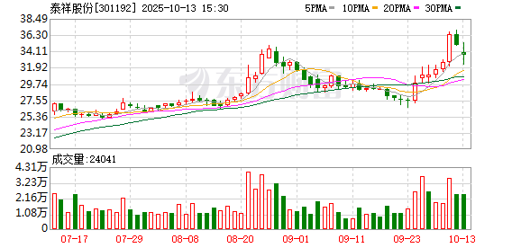 融资方面,泰祥股份当日融资买入536.06万元。当前融资余额1.02亿元,占流通市值的2.93%,融资余 额超过近一年90%分位水平,处于高位。 10月10日,泰祥股份跌4.01%,成交额8700.27万元。两融数据显示,当日泰祥股份获融资买入额536.06 万元,融资偿还680.21万元,融资净买入-144.16万元。截至10月10日,泰祥股份融资融券余额合计1.02 亿元。 融券方面,泰祥股份10月10日融券偿还0.00股,融券卖出0.00股,按当日收盘价计算,卖出金额0.00 元;融券余量0.00股,融券余额0.00元,超过近一年90%分位水平,处于高位。 资料显示,十堰市泰祥实业股份有限公司位于湖北省十堰市经济开发区吉林路258号,成立日期1997年7 月29日,上市日期2022年8月11日,公司主营业务涉及公司专注于汽车零部件的研发、制造与销售,致力 成长为符合国际一流标准的动力及传动系统核心零部件的全球供应商。主营业务收入构成为:铝铸件制 品55.59%,主轴承盖34.66%,差速器壳7.48%,材料2.11%,模具0.11%,房租0.04%,支架0.00%,其 他0.00%。 截至6月30日,泰 ...