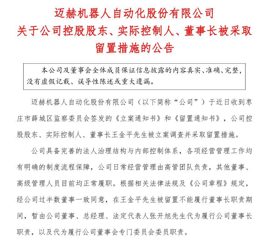 “机器人概念股”迈赫股份董事长王金平被留置调查,80后总经理火线接班