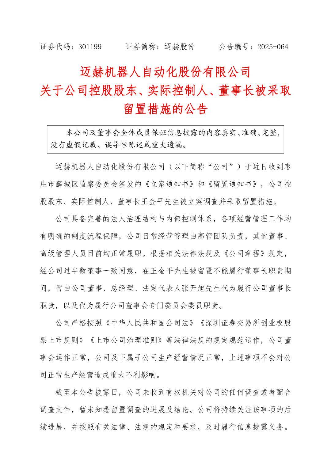 A股又现重磅公告! 公开资料显示,王金平,1966年出生,中国国籍,无永久境外居留权,复旦大学数学系计算数学专业本科、计算机系软件工程专业硕士研究生毕业。2009 年投资山东迈赫投资有限公司,担任该公司执行董事兼总经理;2010年1月迈赫投资等股东发起成立迈赫股份,2017年9月至今担任公司董事长。 迈赫股份是一家专注于为用户提供高端智能装备系统、智慧物联系统的高新技术企业,专业从事基于机器人和物联网技术的高端智能装备系统和智慧物联 系统的研发设计、制造集成、销售和智慧运维等服务。 在王金平被留置不能履行董事长职责期间,暂由公司董事、总经理、法定代表人张开旭代为履行公司董事长职责。公司日常经营管理由高管团队负责,其 他董事、高级管理人员目前均正常履职。 2025年前三季度,公司实现营业收入8.57亿元,同比下降4.78%;实现归母净利润9841.56万元,同比增长46.87%。 迈赫股份表示,截至本公告披露日,公司未收到有权机关对公司的任何调查或者配合调查文件,暂未知悉留置调查的进展及结论。公司将持续关注该事项 的后续进展,并按照有关法律、法规的规定和要求,及时履行信息披露义务。 ...