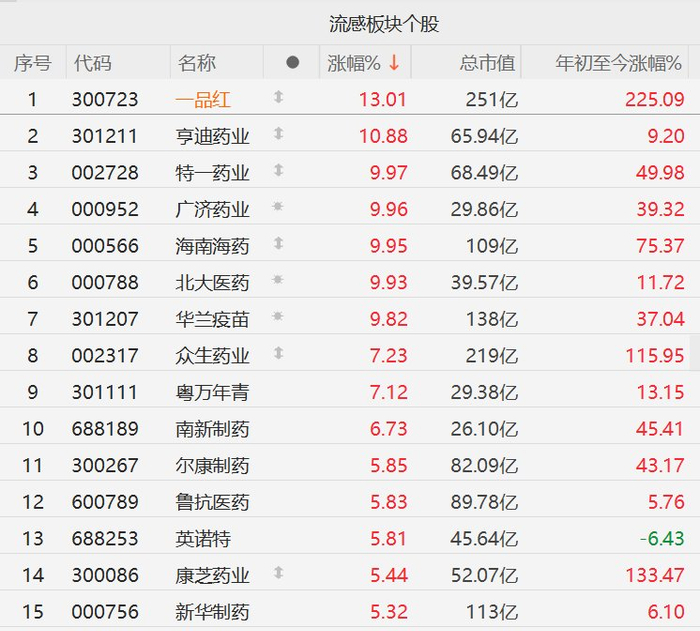 Core Insights - The flu season has arrived earlier than expected, leading to increased activity in flu-related stocks in the A-share market [1] - Significant sales increases have been reported for antiviral medications, with Oseltamivir sales up 237% and Mabalaosavir up 180% in the past week [1] Stock Performance - Notable stock movements include: - Yipinhong (一品红) up 13% - Hendi Pharmaceutical (亨迪药业) up nearly 11% - Special One Pharmaceutical (特一药业) and Guangji Pharmaceutical (广济药业) both hitting the 10% daily limit up - Other companies like Hainan Haiyao (海南海药) and Peking University Pharmaceutical (北大医药) also saw significant gains [1][2] - The overall market sentiment is positive, with many flu-related stocks experiencing substantial year-to-date increases, such as: - Yipinhong with a year-to-date increase of 225.09% - Hainan Haiyao with a 75.37% increase [2] Consumer Behavior - Data from Alibaba Health indicates a marked increase in the attention and purchase volume of flu medications over the past two weeks, with a more than 500% week-on-week growth in the number of buyers for antiviral drugs [1] - Mabalaosavir has shown exceptional performance, with a 600% increase in the number of buyers compared to the previous period, reflecting heightened consumer awareness regarding flu prevention and treatment [1]