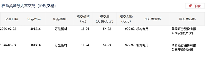| 权益类证券大宗交易(协议交易) | | | | | | | 团 下载 | | --- | --- | --- | --- | --- | --- | --- | --- | | 交易日期 | 证券代码 | 证券简称 | 成交价格 (元) | 成交量 (万股/万份) | 成交金额 (万元) | 买方营业部 | 卖方营业部 | | 2026-02-05 | 301216 | 万凯新材 | 18.74 | 266.80 | | 4,999.8$信证券股份有限 | 华泰证券股份有限 | | | | | | | | 公司北京建国门证 | 公司安徽分公司 | | | | | | | | 劳营业部 | | 2月5日,万凯新材大宗交易成交266.8万股,成交额4999.83万元,占当日总成交额的22.62%,成交价 18.74元,较市场收盘价21.74元折价13.8%。 ...