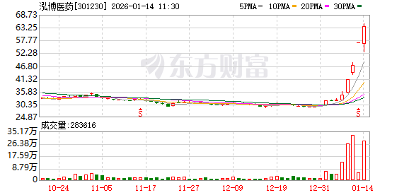 交易行情显示,1月14日,泓博医药收涨16.1%,收盘价为65.76元/股。 泓博医药表示,自1月8日以来,公司股价累计涨幅超过大部分同行业公司,且显著高于创业板指、创业 板50、深证成指等相关指数涨幅,公司股价持续上涨积累了较多的获利调整风险,广大投资者务必充分 了解二级市场交易风险,理性决策,审慎投资。 北京商报讯(记者 丁宁)1月14日晚间,泓博医药(301230)发布股票交易异常波动及股票交易严重异 常波动公告显示,现阶段公司DiOrion平台药物研发服务的直接收入占公司整体营业收入的比重较小, 对公司整体经营情况不构成重大影响。 ...