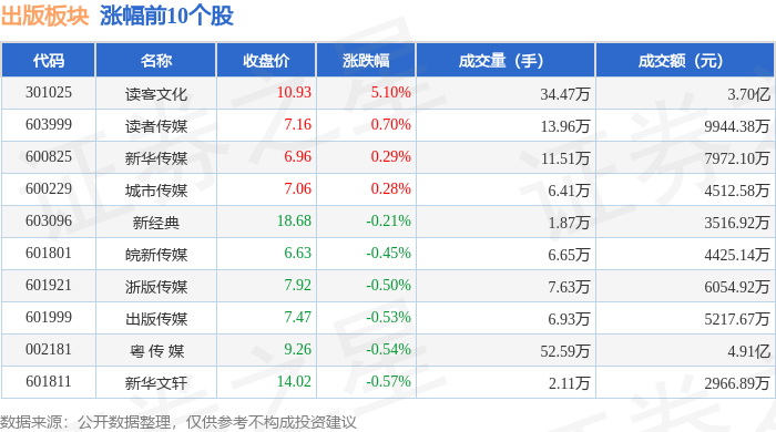 证券之星消息,11月26日出版板块较上一交易日下跌1.22%,荣信文化领跌。当日上证指数报收于 3864.18,下跌0.15%。深证成指报收于12907.83,上涨1.02%。出版板块个股涨跌见下表: | 代码 | 名称 | 收盘价 | 涨跌幅 | 成交量(手) | 成交额(元) | | | --- | --- | --- | --- | --- | --- | --- | | 301025 | 读客文化 | 10.93 | 5.10% | 34.47万 | | 3.70亿 | | 603999 | 读者传媒 | 7.16 | 0.70% | 13.96万 | | 9944.38万 | | 600825 | 新华传媒 | 6.96 | 0.29% | 11.51万 | | 7972.10万 | | 600229 | 城市传媒 | 7.06 | 0.28% | 6.41万 | | 4512.58万 | | 603096 | 新经典 | 18.68 | -0.21% | 1.87万 | | 3516.92万 | | 601801 | 皖新传媒 | 6.63 | -0.45% | 6.65万 | | 4425.14 ...