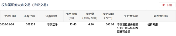 1月16日,华康洁净大宗交易成交4.7万股,成交额203.98万元,占当日总成交额的0.29%,成交价43.4 元,较市场收盘价48.22元折价10%。 | 权益类证券大宗交易(协议交易) | | | | | | | | 团 下载 | | --- | --- | --- | --- | --- | --- | --- | --- | --- | | 交易日期 | 证券代码 | 证券简称 | 成交价格 (元) | 成交量 (万股/万份) | 成交金额 (万元) | 买方营业部 | 卖方营业部 | | | 2026-01-16 | 301235 | 华康洁净 | 43.40 | 4.70 | 203.98 华泰证券股份有限 | 公司广州云城东路 证券营业部 | 机构专用 | | ...