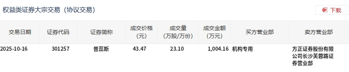 10月16日,普蕊斯大宗交易成交23.1万股,成交额1004.16万元,占当日总成交额的8.94%,成交价43.47 元,较市场收盘价44.36元折价2.01%。 | 权益类证券大宗交易(协议交易) | | | | | | | 团 下载 | | --- | --- | --- | --- | --- | --- | --- | --- | | 交易日期 | 证券代码 | 证券简称 | 成交价格 (元) | 成交量 (万股/万份) | 成交金额 (万元) | 买方营业部 | 卖方营业部 | | 2025-10-16 | 301257 | 普荔斯 | 43.47 | 23.10 | 1,004.16 机构专用 | | 方正证券股份有限 公司长沙美蓉路证 劳营业部 | ...