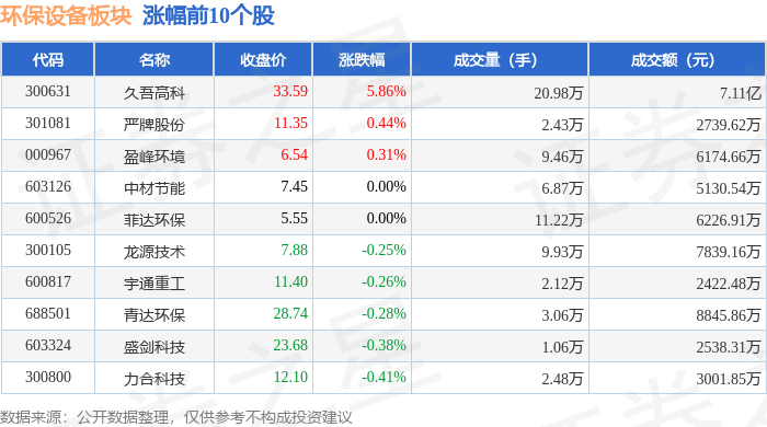 证券之星消息,11月20日环保设备板块较上一交易日下跌0.6%,*ST清研领跌。当日上证指数报收于 3931.05,下跌0.4%。深证成指报收于12980.82,下跌0.76%。环保设备板块个股涨跌见下表: | 代码 | 名称 | 主力净流入(元) | 主力净占比 游资净流入 (元) | | 游资净占比 散户净流入 (元) | | 散户净占比 | | --- | --- | --- | --- | --- | --- | --- | --- | | 300631 久吾高科 | | 5755.99万 | 8.09% | -1687.96万 | -2.37% | -4068.03万 | -5.72% | | 688501 青达环保 | | 1759.28万 | 19.89% | 235.01万 | 2.66% | -1994.29万 | -22.54% | | 300105 龙源技术 | | 291.67万 | 3.72% | -399.40万 | -5.09% | 107.73万 | 1.37% | | 300800 力合科技 | | 110.13万 | 3.67% | -276.11万 | -9.20% | ...