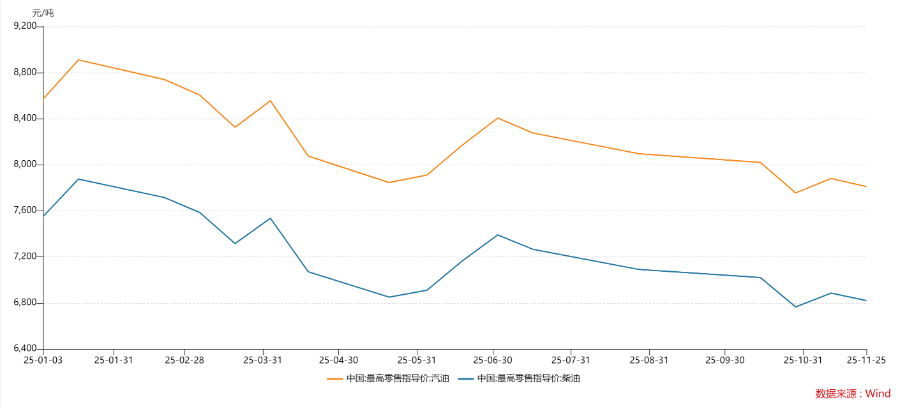热点栏目 自选股 数据中心 行情中心 资金流向 模拟交易 客户端 (成品油:王雪琴) 选题背景:本计价周期以来(2025年11月24日24时至12月8日24时),国际原油价格呈现窄幅波动行 情,变化率持续处于负值范围运行。今晚24时,国内成品油零售限价有望达成年内第十一次下调。 卓创资讯观点:本计价周期以来(2025年11月24日24时至12月8日24时),期间欧洲局势扰动,但是美 国石油累库,叠加感恩节假期,市场交投清淡。市场多空因素交织,原油价格未能走出单边行情,整体 呈现窄幅波动态势。受此影响,本计价周期内,原油变化率持续在负值范围内运行,截至12月5日收 盘,国内第10个工作日参考原油变化率-1.24%,12月8日24时汽、柴油零售限价每吨或均下调55元,折 合升价92#汽油、95#汽油、0#柴油分别下调0.04、0.05、0.05元。本次下调落实后,消费者用油成本将 继续减少。以油箱容量为50升的小型私家车为例,加满一箱92#汽油将少花2元左右。以月跑两千公里, 百公里油耗在8升的小型私家车为例,到下次调价窗口也就是12月22号24点之前的半个月内,消费者用 油成本将下降3元。物流行业,以月跑100 ...