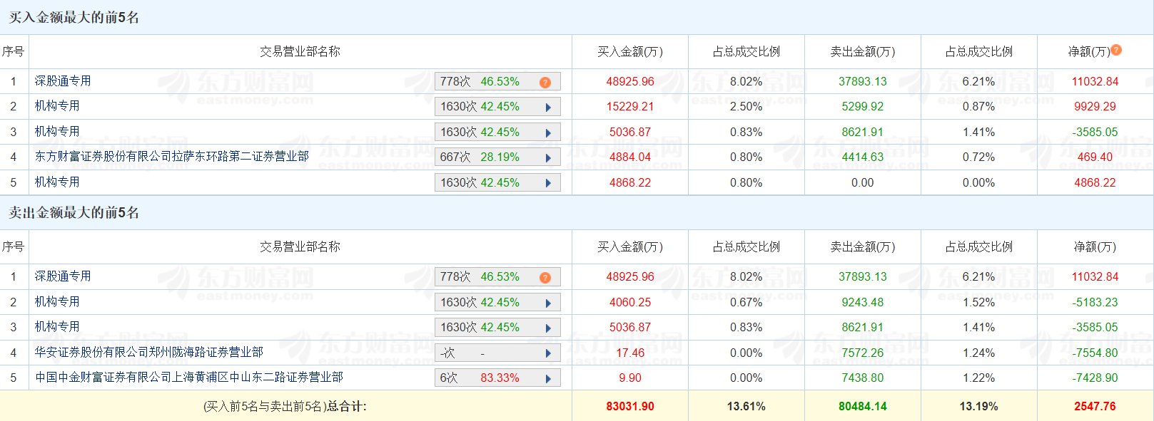 | 序号 | 交易营业部名称 | | 买入金额(万) | 占总成交比例 | | --- | --- | --- | --- | --- | | 深股通专用 | | 778次 46.53% (2) | 48925.96 | 8.02% | | 2 机构专用 | 8351money.com | 1630次 42.45% | 15229.21 | 2.50% | | 3 机构专用 | | 1630次 42.45% | 5036.87 | 0.83% | | 4 | 东方财富证券股份有限公司拉萨东环路第二证券营业部 | 667次 28.19% | 4884.04 | 0.80% | | 机构专用 5 | | 1630次 42.45% | 4868.22 | 0.80% | | 序号 | 交易营业部名称 | | | 买入金额(万) | 占总成交比例 | | --- | --- | --- | --- | --- | --- | | | 深股通专用 | 778次 46.53% | 9 | 48925.96 | 8.02% | | 2 | eastmoney.com 机构专用 | 1630次 42.45% | | 4060 ...