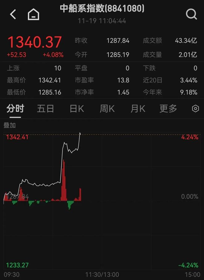 Core Viewpoint - The China Shipbuilding sector experienced a significant increase, with the sector index rising over 4% as of the report's publication [1]. Group 1: Stock Performance - China Shipbuilding Defense saw a peak increase of over 9%, currently up over 7% [3]. - Other stocks in the sector, including China Shipbuilding Han Guang and Jiu Zhi Yang, also reported gains exceeding 6% [3]. - All stocks within the sector showed positive performance, indicating a strong market sentiment [3]. Group 2: Individual Stock Details - China Shipbuilding Defense: Current price at 28.36, up 7.83% [4]. - China Shipbuilding Han Guang: Current price at 18.66, up 6.69% [4]. - Jiu Zhi Yang: Current price at 43.10, up 6.71% [4]. - Kunshan Intelligent: Current price at 20.00, up 3.95% [4]. - ST Emergency: Current price at 8.89, up 4.10% [4]. - China Marine Defense: Current price at 30.54, up 3.49% [4]. - China Shipbuilding Technology: Current price at 12.30, up 2.16% [4]. - China Shipbuilding: Current price at 34.73, up 2.09% [4]. - China Euro Marine Control: Current price at 15.25, up 1.87% [4]. - China Power: Current price at 20.67, up 1.37% [4].