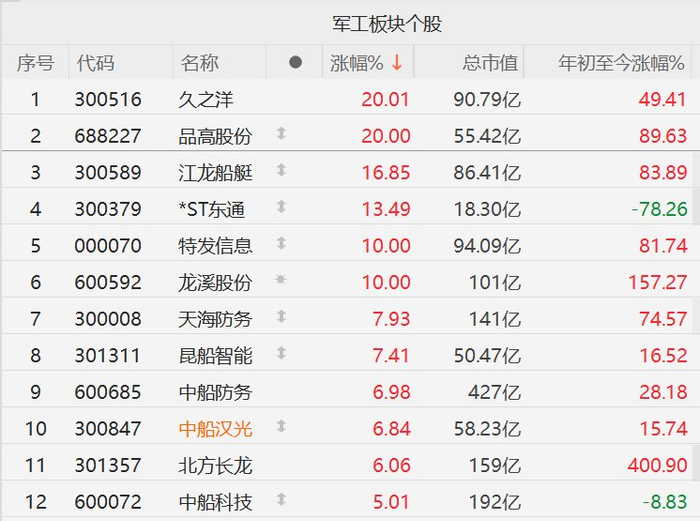 格隆汇11月21日|A股市场军工股表现强势,其中,久之洋、品高股份20CM涨停,江龙船艇涨超 16%,特发信息、龙溪股份10CM涨停,天海防务、昆船智能涨超7%,中船防务、中船汉光、北方长龙 涨超6%,中船科技涨超5%。 | | | | | 军工板块个股 | | | | --- | --- | --- | --- | --- | --- | --- | | 序号 | 代码 | 名称 | | 涨幅% ↓ | 总市值 | 年初至今涨幅%。 | | 1 | 300516 | 久之洋 | | 20.01 | 90.79亿 | 49.41 | | 2 | 688227 | 品高股份 | 1 | 20.00 | 55.42 Z | 89.63 | | 3 | 300589 | 江龙船艇 | 1 | 16.85 | 86.41 乙 | 83.89 | | 4 | 300379 | *ST东通 | 1 | 13.49 | 18.30亿 | -78.26 | | 5 | 000070 | 特发信息 | 1 | 10.00 | 94.09亿 | 81.74 | | 6 | 600592 | 龙溪股份 | * | 10.00 | ...