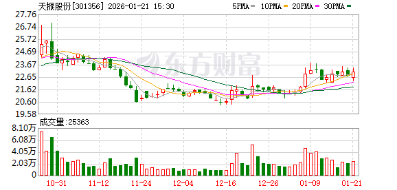 天振股份上市首日开盘价和当日最高价均为63.00元,为该股上市以来最高价。该股目前处于破发 状态。 天振股份首次公开发行股票募集资金总额为1,890,000,000元,扣除发行费用后,实际募集资金净额 为人民币1,784,622,476.45元。天振股份最终募集资金净额比原计划多41,162.25万元。2022年11月7日, 天振股份发布的招股说明书显示,该公司拟募集资金137,300.00万元,分别用于年产3000万平方米新型 无机材料复合地板智能化生产线项目、年产2500万平方米新型无机材料复合地板智能化生产线项目、补 充流动资金。 中国经济网北京1月23日讯 天振股份(301356.SZ)今日收报24.04元,跌幅2.16%。 天振股份于2022年11月14日在深交所创业板上市,公开发行股票数量为3,000.00万股(占发行后总 股本的25.00%),发行价格为63.00元/股,保荐机构(主承销商)为安信证券股份有限公司(现更名为 国投证券股份有限公司),保荐代表人为唐斌、肖江波。 天振股份首次公开发行股票的发行费用(不含增值税)共计10,537.75万元,其中,承销、保荐费用 8,335.80万元。 ...