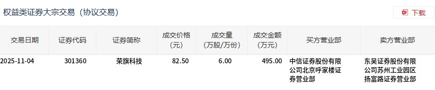 Group 1 - On November 4, Rongqi Technology executed a block trade of 60,000 shares, with a transaction amount of 4.95 million yuan, accounting for 2.51% of the total transaction volume for the day [1] - The transaction price was 82.5 yuan, which represents a discount of 1.2% compared to the market closing price of 83.5 yuan [1] - The buyer was CITIC Securities Co., Ltd., and the seller was Dongwu Securities Co., Ltd. [2]
