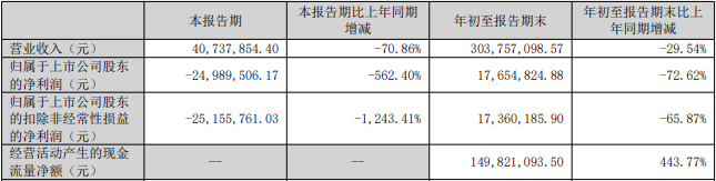 Core Insights - The company reported a significant decline in revenue and net profit for the third quarter, indicating potential challenges in its operational performance [1] Financial Performance - The company's revenue for the first three quarters reached 300 million, representing a year-on-year decrease of 29.54% [1] - The net profit attributable to shareholders was 17.65 million, down 72.62% year-on-year [1] - The net profit excluding non-recurring gains and losses was 17.36 million, reflecting a decline of 65.87% compared to the previous year [1]