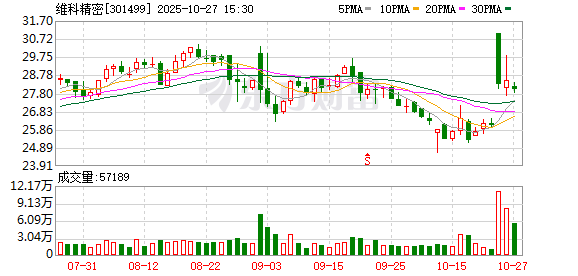 证券代码:301499 证券简称:维科精密 公告编号:2025-042 上海维科精密模塑股份有限公司 上海维科精密模塑股份有限公司(以下简称"公司")于 2025 年 10 月 27 日收到深圳证券交易所(以下简称"深交所")出具的《关于上海维科精密模塑 股份有限公司向不特定对象发行可转换公司债券申请文件的通知》(深证上审 [2025]208 号)。深交所对公司报送的向不特定对象发行可转换公司债券的申请 文件进行了核对,认为申请文件齐备,决定予以受理。 公司本次向不特定对象发行可转换公司债券事项尚需通过深交所审核,并获 得中国证券监督管理委员会(以下简称"中国证监会")作出同意注册的批复后 方可实施。公司本次向不特定对象发行可转换公司债券事项最终能否通过深交所 审核并获得中国证监会同意注册的批复及其时间尚存在不确定性。公司将根据该 事项的进展情况,按照相关法律法规的相关规定和要求,及时履行信息披露义务, 敬请广大投资者注意投资风险。 特此公告。 上海维科精密模塑股份有限公司 董事会 2025 年 10 月 28 日 关于向不特定对象发行可转换公司债券申请 获得深圳证券交易所受理的公告 本公司及董事会全体成员保 ...