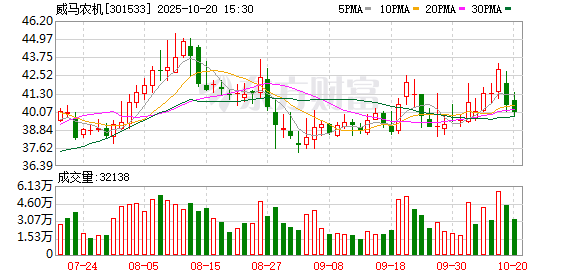 资料显示,威马农机股份有限公司位于重庆市江津区珞璜工业园B区渝祥路3号,成立日期2009年5月12 日,上市日期2023年8月18日,公司主营业务涉及山地丘陵农业机械及其他动力机械产品的研发设计、 生产制造和销售。主营业务收入构成为:山地丘陵农业机械产品77.71%,其他动力机械产品17.83%, 配件及其他4.46%。 截至6月30日,威马农机股东户数9490.00,较上期减少2.61%;人均流通股2996股,较上期增加2.68%。 2025年1月-6月,威马农机实现营业收入3.78亿元,同比减少13.02%;归母净利润1914.08万元,同比减 少48.96%。 融券方面,威马农机10月17日融券偿还0.00股,融券卖出0.00股,按当日收盘价计算,卖出金额0.00 元;融券余量0.00股,融券余额0.00元,超过近一年80%分位水平,处于高位。 10月17日,威马农机跌5.68%,成交额1.82亿元。两融数据显示,当日威马农机获融资买入额2130.12万 元,融资偿还2428.91万元,融资净买入-298.79万元。截至10月17日,威马农机融资融券余额合计1.12 亿元。 分红方面,威马农机A股上市后 ...