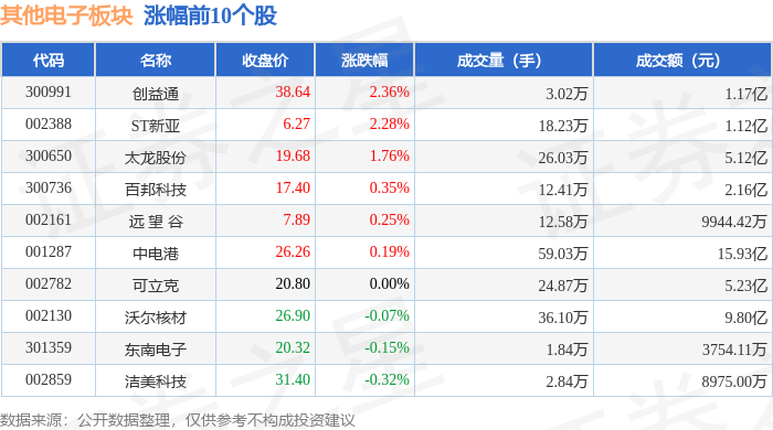 证券之星消息,11月11日其他电子板块较上一交易日下跌3.54%,香农芯创领跌。当日上证指数报收于 4002.76,下跌0.39%。深证成指报收于13289.0,下跌1.03%。其他电子板块个股涨跌见下表: | 代码 | 名称 | 收盘价 | 涨跌幅 | 成交量(手) | | 成交额(元) | | --- | --- | --- | --- | --- | --- | --- | | 300475 | 香农芯创 | 176.58 | -9.83% | | 58.91万 | 113.14 Z | | 301563 | 云汉芯城 | 66.181 | -6.34% | | 3.80万 | 7.08亿 | | 301099 | 雅创电子 | 47.88 | -5.41% | | 11.73万 | 5.79亿 | | 300131 | 英唐智控 | 12.97 | -5.33% | | 307.13万 | 43.02亿 | | 603933 | 睿能科技 | 20.88 | -5.00% | | 15.83万 | 3.35 Z | | 001298 | 好上好 | 32.62 | -4.03% | | 18.86万 ...
