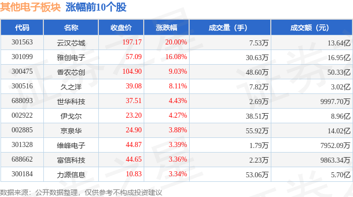 证券之星消息,10月21日其他电子板块较上一交易日上涨3.53%,云汉芯城领涨。当日上证指数报收于 3916.33,上涨1.36%。深证成指报收于13077.32,上涨2.06%。其他电子板块个股涨跌见下表: 从资金流向上来看,当日其他电子板块主力资金净流入6.32亿元,游资资金净流出5.04亿元,散户资金净 流出1.28亿元。其他电子板块个股资金流向见下表: | 代码 | 名称 | 主力净流入(元) | 主力净占比 游资净流入(元) | | 游资净占比 散户净流入 (元) | | 散户净占比 | | --- | --- | --- | --- | --- | --- | --- | --- | | 301099 雅创电子 | | 1.70 Z | 10.05% | -9486.84万 | -5.60% | -7544.17万 | -4.45% | | 301563 云汉芯城 | | 1.21亿 | 8.89% | -5527.97万 | -4.05% | -6602.42万 | -4.84% | | 002130 沃尔核材 | | 1.12亿 | 4.97% | -1661.22万 | -0.74% | - ...