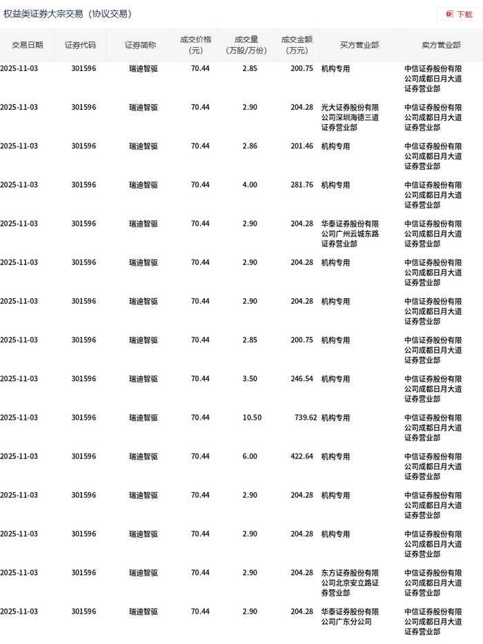 Summary of Key Points Core Viewpoint - On November 3, 2025, a block trade of 557,600 shares of Ruidi Zhichui was executed at a price of 70.44 yuan, representing a discount of 12.99% compared to the market closing price of 80.96 yuan, with a total transaction value of 39.28 million yuan, accounting for 46.9% of the total trading volume for the day [1]. Trading Details - The block trade involved multiple transactions with varying volumes and amounts, all executed at the same price of 70.44 yuan per share [2]. - The total trading volume for the day was significant, with the largest single transaction being 10,500 shares, amounting to 739.62 thousand yuan [2]. - The majority of the trades were conducted by institutional investors, with notable participation from CITIC Securities [2].