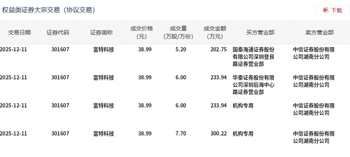 | 交易日期 | 证券代码 | 证券简称 | 成交价格 | 成交量 | 成交会额 | 买方营业部 | 卖方营业部 | | --- | --- | --- | --- | --- | --- | --- | --- | | | | | (元) | (万股/万份) | (万元) | | | | 2025-12-11 | 301607 | 富特科技 | 38.99 | 5.20 | | 202.75 国泰海通证券股份 | 中信证券股份有限 | | | | | | | | 有限公司深圳登良 | 公司湖南分公司 | | | | | | | | 路证券营业部 | | | 2025-12-11 | 301607 | 富特科技 | 38.99 | 6.00 | | 233.94 华泰证券股份有限 | 中信证券股份有限 | | | | | | | | 公司深圳后海中心 | 公司湖南分公司 | | | | | | | | 路证券营业部 | | | 2025-12-11 | 301607 | 富特科技 | 38.99 | 6.00 | | 233.94 机构专用 | 中信证券股份有限 | | | | | | | | | 公司湖南分 ...