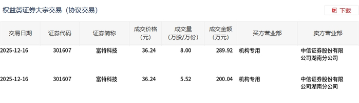 | 交易日期 | 证券代码 | 证券简称 | 成交价格 | 成交量 | 成交会额 | 买方营业部 | 卖方营业部 | | --- | --- | --- | --- | --- | --- | --- | --- | | | | | (元) | (万股/万份) | (万元) | | | | 2025-12-23 | 301607 | 富特科技 | 36.76 | 5.50 | | 202.18 中信证券股份有限 | 中信证券股份有限 | | | | | | | | 公司苏州分公司 | 公司湖南分公司 | | 2025-12-23 | 301607 | 富特科技 | 36.76 | 5.50 | 202.18 | 申万宏源西部证券 | 中信证券股份有限 | | | | | | | | 有限公司乌鲁木齐 | 公司湖南分公司 | | | | | | | | 北京路证券营业部 | | | 2025-12-23 | 301607 | 富特科技 | 36.76 | 8.17 | | 300.33 华泰证券股份有限 | 中信证券股份有限 | | | | | | | | 公司南京分公司 | 公司湖南分公司 | | 2025- ...