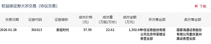 | 交易日期 | 证券代码 | 证券简称 | 成交价格 (元) | 成交量 (万股/万份) | 成交金额 买方营业部 (万元) | 卖方营业部 | | --- | --- | --- | --- | --- | --- | --- | | 2026-01-28 | 301613 | 新铝时代 | 57.59 | 22.62 | 1,302.69中信证券股份有限 | 国泰海通证券股份 | | | | | | | 公司北京呼家楼证 | 有限公司重庆嘉州 | | | | | | | 券营业部 | 路班券营不部 | 1月28日,新铝时代大宗交易成交22.62万股,成交额1302.69万元,占当日总成交额的2.38%,成交价 57.59元,较市场收盘价58元折价0.71%。 ...