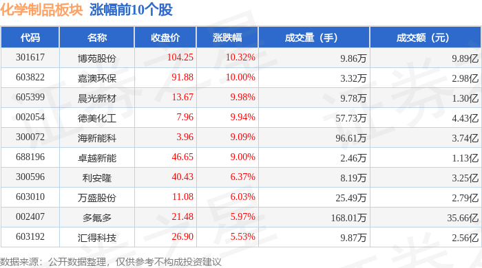 Group 1 - The A-share market saw a significant decline in chemical raw material stocks, with notable drops in several companies [1] - Boyuan Co., Ltd. experienced the largest decline at over 12%, while Chengxing Co., Ltd. fell by over 8% [1] - Other companies such as Haike Xinyuan, Duofluor, and Guanghua Technology also reported declines exceeding 6% [1] Group 2 - Specific stock performance data includes: - Boyuan Co., Ltd. down 12.63% with a market cap of 11.8 billion and a year-to-date increase of 127.50% [2] - Chengxing Co., Ltd. down 8.56% with a market cap of 6.071 billion and a year-to-date increase of 54.66% [2] - Haike Xinyuan down 6.45% with a market cap of 6.105 billion and a year-to-date increase of 109.48% [2] - Duofluor down 6.09% with a market cap of 23.5 billion and a year-to-date increase of 67.08% [2] - Guanghua Technology down 4.04% with a market cap of 9.5 billion and a year-to-date increase of 23.67% [2] - Kaisheng New Materials down 3.29% with a market cap of 9.877 billion and a year-to-date increase of 58.92% [2]