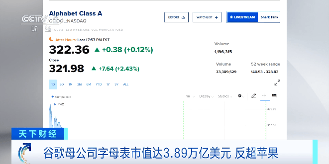 谷歌母公司字母表市值达3.89万亿美元 反超苹果