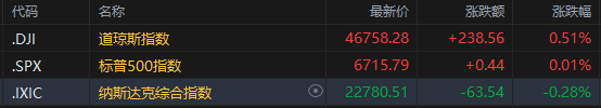 周五(10月3日),美股三大指数涨跌不一,其中道指和标普收于新高。 截至收盘,道琼斯指数涨0.51%,报46758.28点;标普500指数涨0.01%,报6715.79点,双双刷新了前一天录得的收盘纪录;纳斯达克综合指 数跌0.28%,报22780.51点。 | 代码 | 名称 | 最新价 | 涨跌额 | 涨跌幅 | | --- | --- | --- | --- | --- | | .DJI | 道琼斯指数 | 46758.28 | +238.56 | 0.51% | | SPX | 标普500指数 | 6715.79 | +0.44 | 0.01% | | .IXIC | 纳斯达克综合指数 | ● 22780.51 | -63.54 | -0.28% | 30只道指成分股中,22家上涨,8家下跌。联合健康、旅行者保险、卡特彼勒、强生、高盛和Visa涨超1%,推动道指日内跑赢另外两大指 数。 虽然纳指周五收跌,但该指数本周累计上涨1.32%,表现强于道指(+1.1%)和标普(+1.09%)。小盘股罗素2000指数周五涨0.72%,也刷新 历史纪录,本周累涨1.72%。 前一天,特朗普在采访中表示,若政府持续 ...