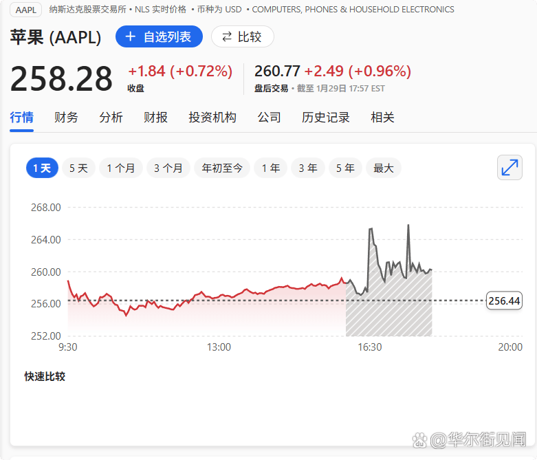 2026.01.30 本文字数:2057,阅读时长大约3分钟 作者 |第一财经 胡弋杰 当地时间1月29日,美股主要股指涨跌互现。微软在公布季度财报后大幅下挫,拖累纳指和标普500指数 走低,与此同时,中东地缘政治紧张局势升温,推动国际油价跳涨。避险需求也一度推动金价盘中短暂 冲高至每盎司5500美元上方,但随后交易员集中获利了结,价格迅速回落。 截至当天收盘,道琼斯工业平均指数上涨55.96点,报49071.56点;标普500指数下跌9.02点,报6969.01 点;纳斯达克综合指数下跌172.33点,报23685.12点。 苹果当季综合毛利率升至48.2%,较上年同期提高1.3个百分点;研发支出108.87亿美元,同比增长 31.7%。经营活动产生的现金流为539.25亿美元,同比大增79.9%。公司当季用于股票回购的资金为 247.01亿美元,并支付39.21亿美元股息,合计向股东返还近320亿美元。董事会同时宣布派发每股0.26 美元现金股息,股息支付日为2026年2月12日。 截至2025年12月27日,苹果持有的现金及现金等价物为453.17亿美元,较上一财季增长26.1%;总负债 为2911.0 ...