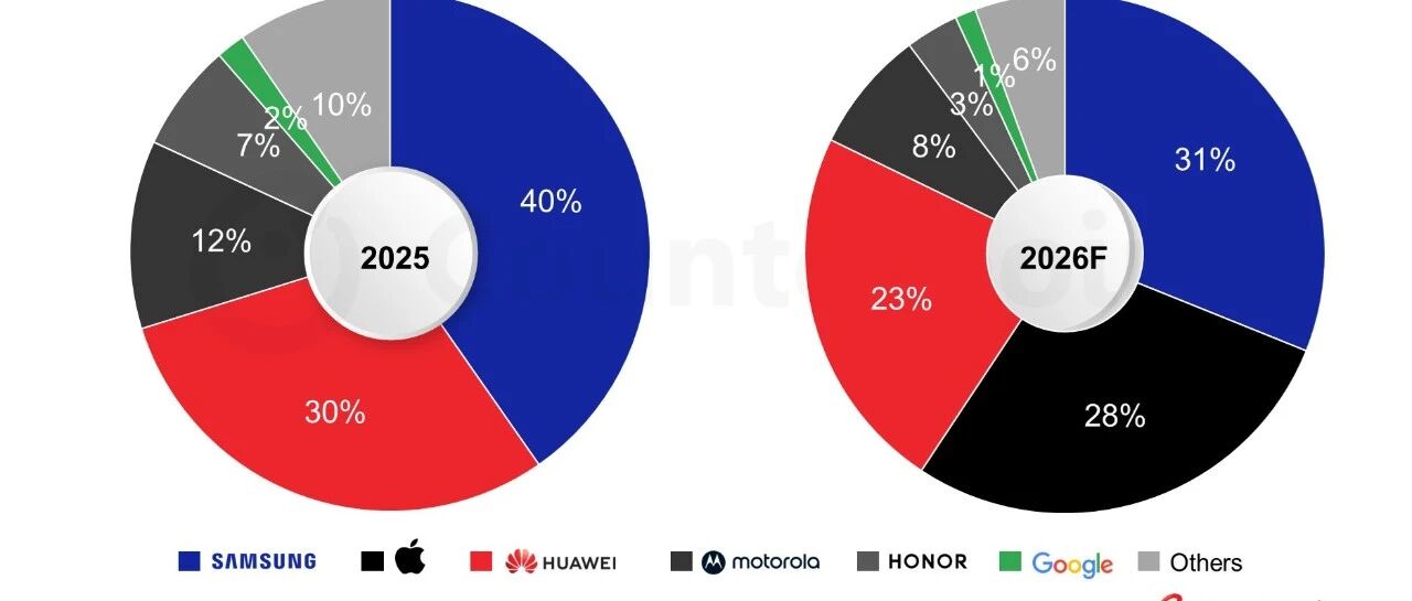 以下文章来源于Counterpoint 咨询 ,作者Liz Lee 作为回应,主要Android OEM正加速更新折叠屏产品组合,以巩固其在高端市场的地位: 全球折叠屏智能手机市场:按OEM划分的市场份额,2025年 vs 2026年预测(2026F) Counterpoint 咨询 . Counterpoint Research 是一家专注于科技行业的全球性研究公司,在全球主要的市场有着强大的影响 力。我们致力于为合作伙伴提供准确、及时的市场数据,帮助他们做出明智的决策。 根据 Counterpoint Research《折叠屏智能手机市场预测》报告 ,受苹果预计入局、智能手机市场持 续高端化以及OEM参与度扩大等因素支撑,2026年全球折叠屏智能手机出货量预计增长20%。随着 苹果准备推出其首款折叠屏iPhone,折叠屏智能手机市场将在2026年进入一个新的竞争阶段。 随着折叠屏市场演进,竞争格局预计将快速变化。苹果的进入将成为关键拐点。 Counterpoint Research 预测 ,苹果将在2026年取得28%的市场份额,并逼近三星的领先位置。这一变化预计将显 著重塑全球竞争版图。 来源:Coun ...