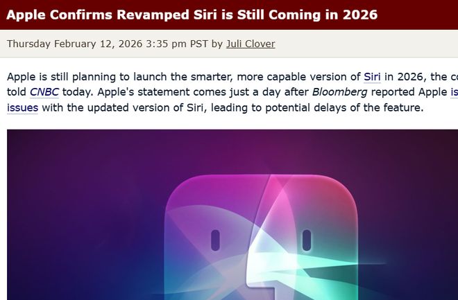来源:环球网 【环球网科技综合报道】2月13日消息,据外媒macrumors报道,苹果公司向CNBC证实,其搭载苹果智 能技术的新版Siri仍计划于2026年推出。该声明发布前一天,彭博社曾爆料新版Siri研发遇阻,可能出现 功能延迟。 据悉,苹果最初计划于2025年春季推出新版Siri,但在当年3月预计发布之际,以功能未就绪为由宣布延 期,后续明确新版Siri将在2026年亮相。尽管苹果未公布更具体的时间,彭博社此前透露,公司内部目 标是将其纳入计划春季推送的iOS 26.4更新中,而iOS 26.4预计2月23日推出开发者预览版,3-4月推送正 式版。 不过最新爆料显示,新版Siri恐无法按时适配iOS 26.4,或将推迟至iOS 26.5甚至iOS 27中推出。苹果表 示,由于从未公开承诺2026年具体推出时间,目前不存在实际延迟,其仍有充足时间在2026年12月前兑 现2025年夏季作出的承诺。 据悉,2026年苹果仍计划推出多款iOS 26小版本更新,iOS 27将于9月正式发布。苹果预计本月晚些时 候推出iOS 26.4首个测试版,届时新版Siri的推送进展或将进一步明朗。(旺旺) ...