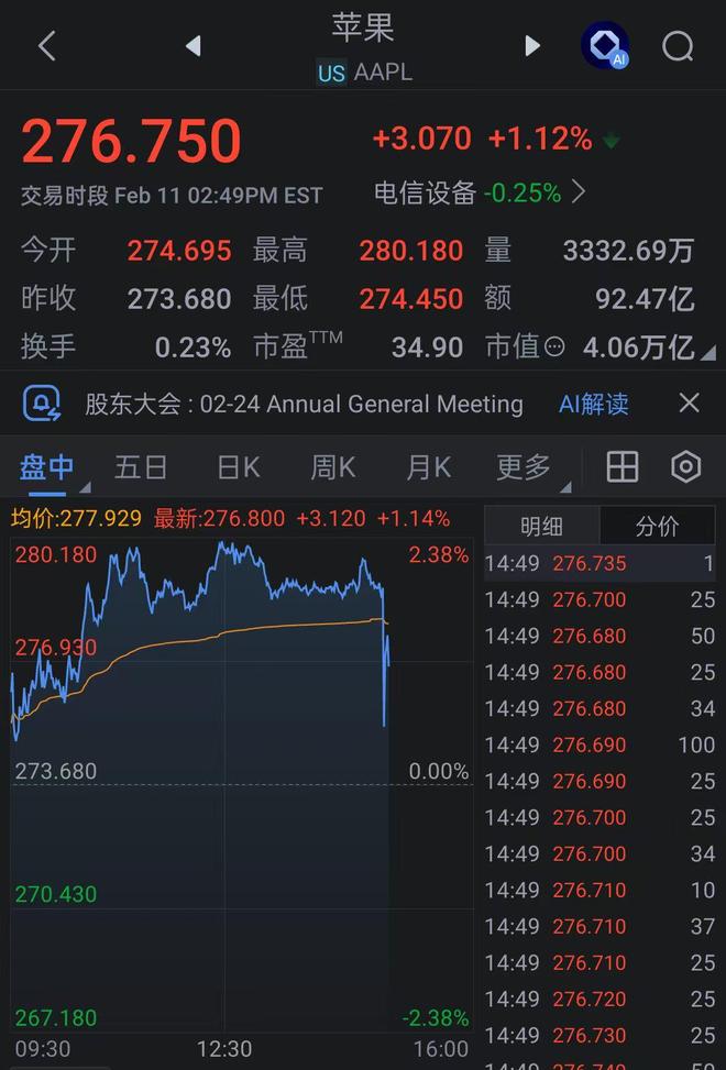 来源:滚动播报 | 苹果 | | | A | | | | --- | --- | --- | --- | --- | --- | | US AAPL | | | | | | | +3.070 +1.12% . 276.750 | | | | | | | 交易时段 Feb 11 02:49PM EST | | 电信设备 -0.25% > | | | | | 274.695 最高 量 3332.69万 | 今井 | 280.180 | | | | | 最低 额 92.47 Z 273.680 | 昨收 | 274.450 | | | | | 023% HZ W 34.90 市值 4.06万亿 | 换手 | | | | | | 股东大会 : 02-24 Annual General Meeting AI解读 | | | | | | | 五日 日K | | 周K 月K | 田名 | | | | 均价:277.929 最新:276.800 +3.120 +1.14% | | | 明细 | 分价 | | | 2.38% | 280.180 | | 14:49 276.735 14:49 276.700 | | 25 | ...