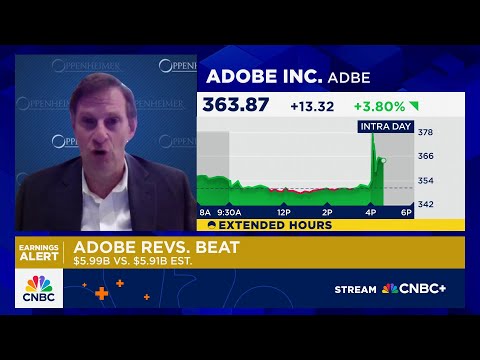 On the other side of things, shares of Adobe moving higher by 4% on the back of earnings and a revenue beat. The company also guiding slightly above estimates. It's been a rough go for Adobe for a couple years now.Hasn't participated in the AIdriven tech rally. Stocks down 20% this year coming into today's print. Now trades at its lowest valuation in more than a decade.Joining me now is Oenheimer senior analyst Brian Schwarz. Has an outperformed rating on the stock. Brian, this is very different from the cl ...
