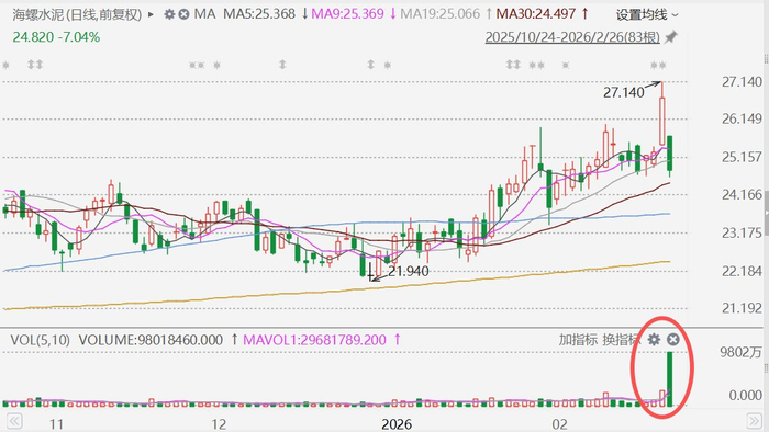 " 水泥 茅" 海螺水泥 (600585.SH、00914.HK)将获控股股东大手笔增持。 2月24日晚间,海螺水泥发布公告称,公司控股股东海螺集团计划自公告披露之日起6个月内增持公司A 股股份,增持金额不低于7亿元且不高于14亿元。本次增持不设定价格区间。 长江商报记者注意到,目前,海螺水泥的股价处于自2020年以来的低位,不过2026年以来,尤其是最近 一个多月,公司股价涨幅明显,1月20日至今,公司股价累计涨幅超19%,期间,成交量较此前也有明 显放大。 业绩方面,海螺水泥的归母净利润连续四年下滑后,在2025年明显企稳。 数据显示,2025年前三季 度,公司的归母净利润为63.05亿元,同比增长21.28%。此外,海螺水泥的资产质量较好,截至2025年 三季度末,公司的资产负债率仅20.59%。 获控股股东大手笔增持 海螺水泥获控股股东增持。 2月24日,海螺水泥发布公告,控股股东海螺集团拟未来6个月内增持公司A股股份,增持金额不低于7 亿元、不高于14亿元,将通过上交所集中竞价方式实施,且不设价格区间。 截至公告日,海螺集团持有公司36.4%股份,此次增持资金来自自有资金及专项贷款。海螺集团承诺增 ...