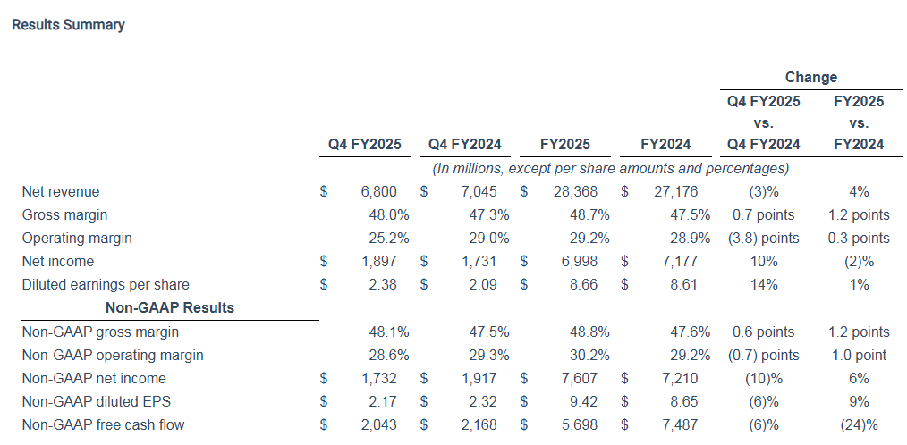 Core Viewpoint - Applied Materials (AMAT.US), the largest semiconductor manufacturing equipment producer in the U.S., reported better-than-expected Q4 FY2025 results and provided an optimistic revenue guidance for Q1 FY2026, indicating that demand for AI chip production equipment may offset weaknesses in some industry sectors [1][3]. Financial Performance - Q4 FY2025 revenue decreased by 3% year-over-year to $6.8 billion, surpassing analyst expectations of $6.68 billion [1][2]. - Non-GAAP net income for Q4 was $1.732 billion, a 10% decline year-over-year, with adjusted earnings per share (EPS) of $2.17, exceeding the expected $2.11 [1][2]. - The semiconductor systems segment generated $4.76 billion in revenue, down 8% from $5.177 billion in the same quarter last year [2]. Future Outlook - For Q1 FY2026, Applied Materials expects revenue of $6.85 billion (plus or minus $500 million), which is better than the analyst consensus of $6.79 billion [3][4]. - The company anticipates adjusted EPS of $2.18 (plus or minus $0.20), also above the expected $2.14 [3][4]. Market Dynamics - The demand for advanced memory chips driven by AI applications is leading to increased investment in wafer fabrication equipment, contributing to order growth for Applied Materials [4]. - The company’s CFO indicated preparations to support higher demand starting in the second half of calendar year 2026 based on discussions with customers and partners [4]. Regulatory Environment - Recent U.S. export restrictions have complicated the delivery of certain products and services to Chinese customers, which is expected to reduce revenue by $600 million in FY2026 [4]. - The CEO does not anticipate significant new restrictions affecting equipment exports to China [4].