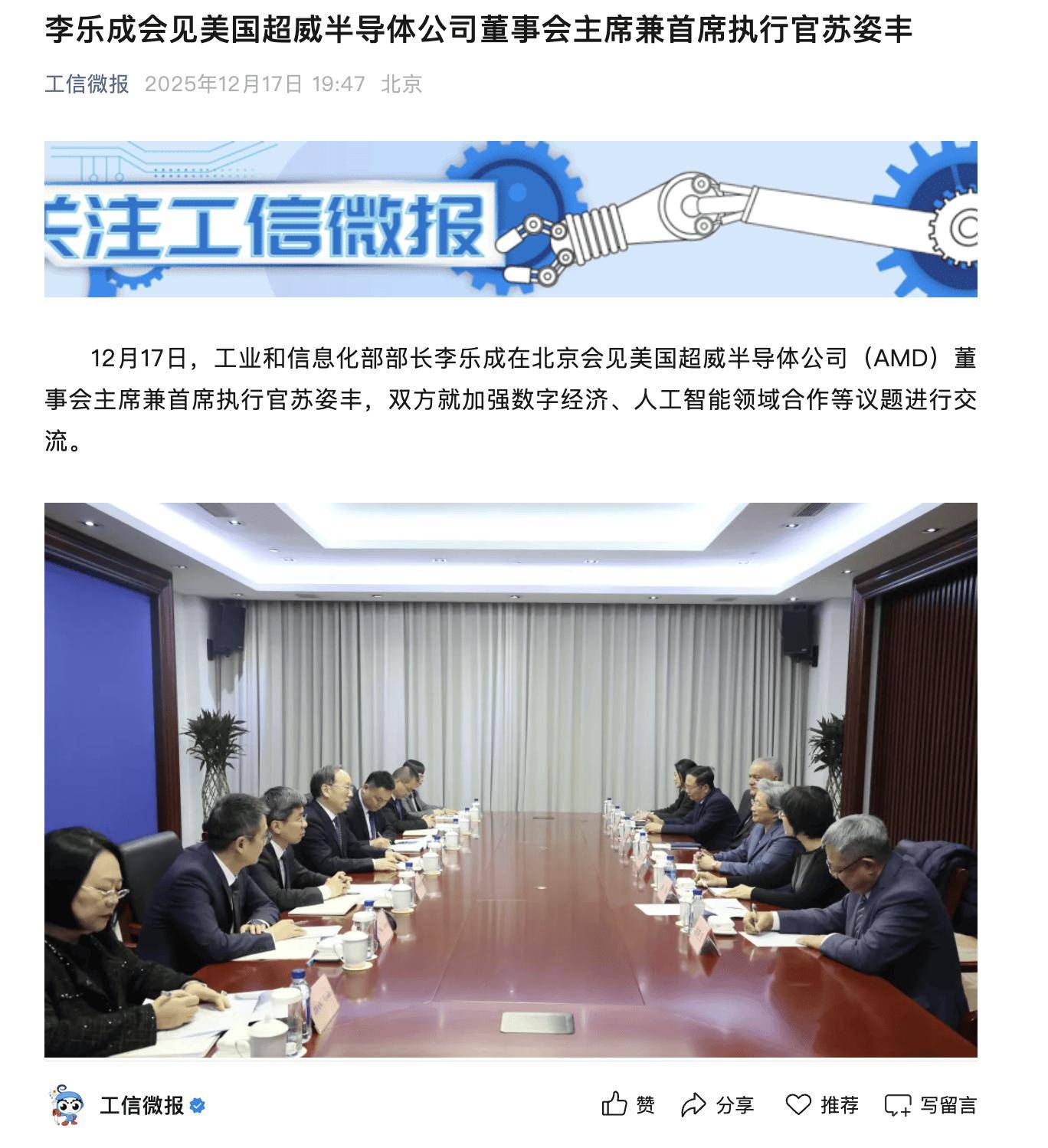 IT之家 12 月 17 日消息,12 月 17 日,工业和信息化部部长李乐成在北京会见美国超威半导体公司(AMD)董事会主席兼首席执行官苏姿丰,双方就加强 数字经济、人工智能领域合作等议题进行交流。 IT之家从工信部方面获悉,李乐成表示,中国拥有丰富的数据资源和应用场景,数字技术、人工智能等正快速发展、赋能千行百业。中国将坚定不移推进新 型工业化,不断扩大高水平对外开放,为包括 AMD 在内的外资企业提供更多合作机遇。希望 AMD 继续深耕中国市场,与中国产业链上下游企业一道创新 成长,实现互利共赢发展。 苏姿丰感谢中国工业和信息化部对 AMD 在华发展的支持,表示将继续深化在华投资,进一步加强对华合作,共同促进产业创新发展。 ...