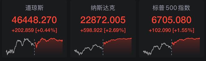 美联储官员接连释放鸽派信号,扭转了市场对12月政策的预期,降息概率飙升至80%。 投资者对上周的经济担忧和估值忧虑暂时抛诸脑后,逢低买盘推动美股迎来大反弹, 标普500收涨近1.6%,创六周最大涨幅;纳指收涨2.7%, 创5月来最 佳单日表现。 比特币盘中涨超4%,以太坊一度涨近9%;原油扭转三连跌、收涨超1%脱离一个月低位;黄金盘中转涨超1%,两连阳;美债收益率全面下跌。 据央视新闻,中美两国元首通电话,这一消息进一步提振了市场情绪。 风险资产包括股票、加密货币、原油和避险资产黄金、美债同步走高: 值得注意的是,美元指数并未出现走低趋势,窄幅震荡于100关口上方。 2026"股神版"见闻历!投资不容错过 美股科技股领衔"万物齐涨" 美股早盘,在强烈的降息预期推动下,美股三大股指强势高开,一扫上周的阴霾。 避险资产黄金和美债也同步走高,其中黄金涨超1.70%。 盘中,纳指涨超2%,半导体指数更是暴涨3.4%。恐慌指数VIX则应声大跌10%。 午盘,旧金山联储主席戴利(Daly)也明确表示支持12月降息,进一步巩固了市场的宽松预期。 最终,美股全线大涨:标普500涨1.55%,报6705.12点,道指收涨0.4 ...