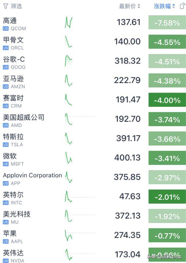 2月5日晚间,全球市场大溃败,美股三大指数大跌,道指跌约600点,纳指跌近2%。 科技股集体下跌。 | 了 筛选 | | 最新价 : | 涨跌幅 : □ | | --- | --- | --- | --- | | 高通 | N | 137.61 | -7.58% | | us QCOM | | | | | 甲骨文 | | 140.00 | -4.55% | | US ORCL | | | | | 谷歌-C | | 318.32 | -4.51% | | us GOOG | | | | | 亚马逊 | 1 | 222.79 | -4.38% | | US AMZN | | | | | 帯電时 | | 191.47 | -4.00% | | us CRM | | | | | 美国超威公司 | | 192.70 | -3.74% | | US AMD | | | | | 特斯拉 | | 391.17 | -3.66% | | US TSLA | | | | | 微软 | | 400.13 | -3.41% | | US MSFT | | | | | Applovin Corporation | | 375.85 | ...