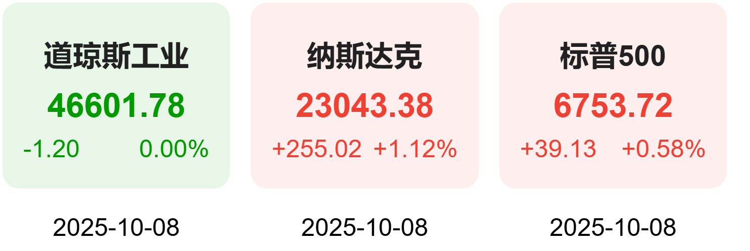 Market Overview - US stock market rose on October 8, driven by enthusiasm for AI, overshadowing concerns over the government shutdown [1] - Major indices showed positive performance: S&P 500 up 0.58% to 6753.72 points, Dow Jones flat at 46601.78 points, and Nasdaq up 1.12% to 23043.38 points [3] Company Highlights - AMD announced a multi-billion dollar GPU supply agreement with OpenAI, leading to an 11% increase in its stock price, reaching a new high [1][6] - Nvidia's CEO Jensen Huang reported high demand for the Blackwell product and confirmed investment in Elon Musk's xAI [1][6] - The semiconductor index surged, propelled by the strong performances of AMD and Nvidia [1][6] Commodity Market - Gold prices surpassed $4000, maintaining strength due to concerns over the government shutdown and expectations of Federal Reserve rate cuts [1] - Silver also saw significant gains during the same period [1] Global Market Performance - European markets showed positive trends with France's CAC40 up 1.07%, UK's FTSE 100 up 0.69%, and Germany's DAX up 0.87% [9] - Asian markets had mixed results, with the Hang Seng Index remaining flat and the Hang Seng Tech Index up 0.75% [9]