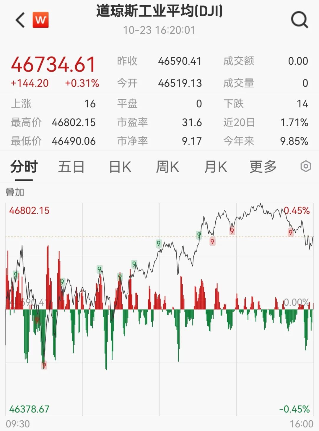 【导读】美股全线上涨,中国资产表现抢眼;欧美接连宣布制裁俄罗斯,国际油价狂飙 大家早上好!昨夜今晨,又有很多大事发生。 美国三大股指全线收涨,中概股整体跑赢大盘。欧美接连宣布制裁俄罗斯,国际油价狂飙!白宫表示,特朗普与普京会晤并非完全不可能。普京表示,布 达佩斯会晤更像是改期而非取消。消息传出后,油价跌幅收窄。 美国三大股指全线收涨 美国三大股指全线收涨,道指涨0.31%,标普500指数涨0.58%,纳指涨0.89%。霍尼韦尔国际涨6.81%,3M公司涨2.61%,亚马逊涨1.44%,领涨道指。 道琼斯工业平均(DJI) 10-23 16:20:01 | 46734.61 | | --- | | +144.20 +0.31% 今开 46519.13 成交量 0 | | 上涨 2017-16-16 平盘 2017-04-04 下跌 2017-0 14 | | 最高价 46802.15 市盈率 31.6 近20日 1.71% | | 最低价 46490.06 市净率 | | 分时 五日 日K 周K 月K 更多 ◎ | 叠加 46802.15 .45% 46378.67 -0.45% 09:30 16:00 标普5 ...