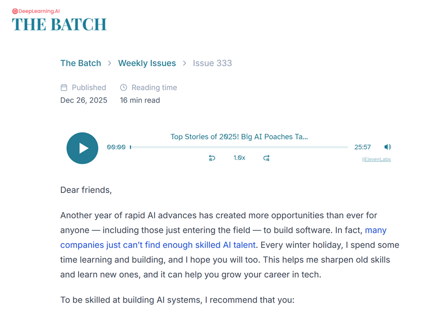 要点提炼: AI工业时代的黎明:2025年标志着AI从"学术探索"正式迈向"工业化基础设施"时代。AI投资成为驱动美国GDP 增长的核心力量,全球年度资本支出突破3000亿美元。 万亿级投入与能源焦虑:科技巨头(如OpenAI、微软、亚马逊)开启"星际之门"等超级数据中心计划,单项投 资动辄数千亿美元。电力供应成为硬约束,科技公司开始通过重启核电站(如三里岛)来保障算力需求。 推理模型与智能体化:以OpenAI o1和DeepSeek-R1为代表的推理模型成为主流,AI具备了"多步思考"能力。 "智能体编码(Agentic Coding)"爆发,AI智能体已能独立处理复杂的软件开发任务,编程效率显著提升。 天价薪酬重塑人才市场:顶尖人才身价比肩体育明星,Meta等巨头甚至开出高达3亿美元的四年期薪酬包。 | The Batch > Weekly Issues > Issue 333 | | --- | | 白 Published 0 Reading tim | | --- | | Dec 26, 2025 16 min read | | Top Stories of 2025! Big AI Poaches ...